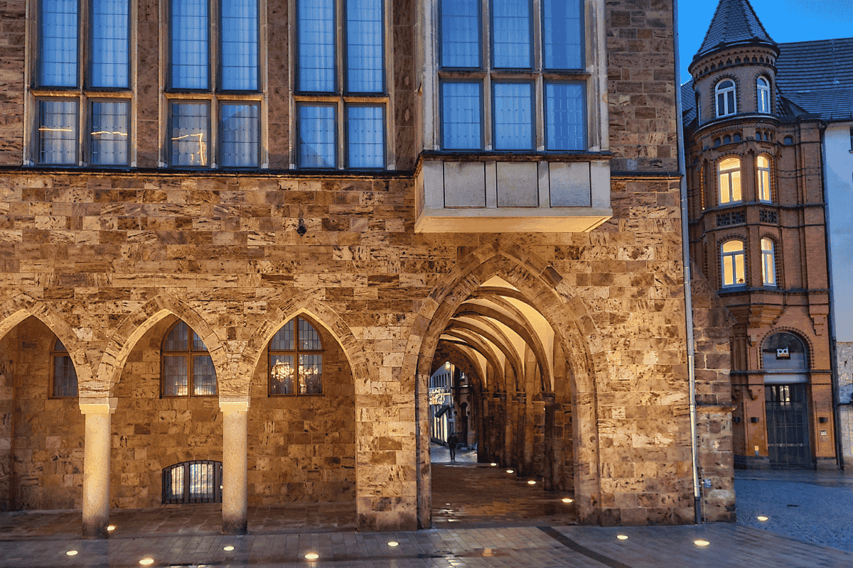 1260 setzten die Bürger Mindens am Rande der Domimmunität ein Zeichen. Sie errichteten das erste Rathaus als repräsentativen Steinbau mit Laube und Kellergewölbe. Damit demonstrierte die Bürgerschaft ihre Eigenständigkeit gegenüber den geistlichen Stadtherren.
