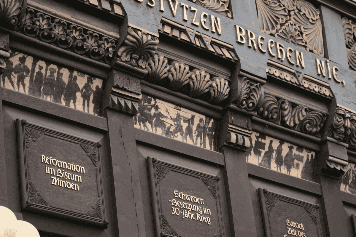 Über dem Erdgeschoss zeigt ein Fries in Form von Scherenschnitten Bilder aus der Mindener Geschichte: